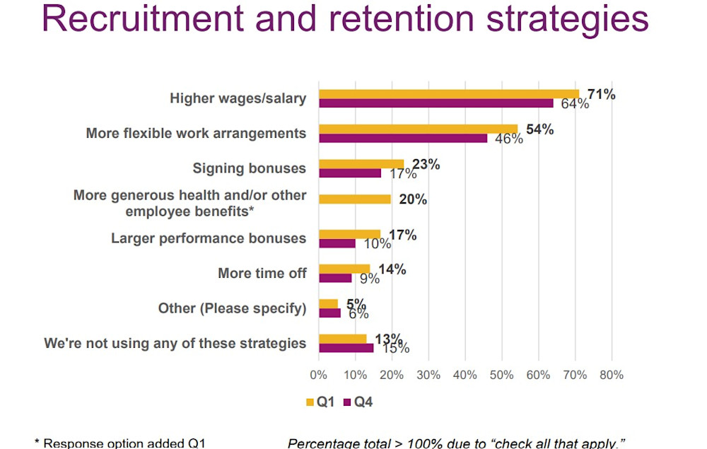 To combat the tight labor market, companies have adopted a number of recruitment and retention strategies, principally higher wages and more flexible work arrangements, although the former has been driven in part by inflationary pressures. Signing bonuses are also increasing as a tactic to attract new talent.